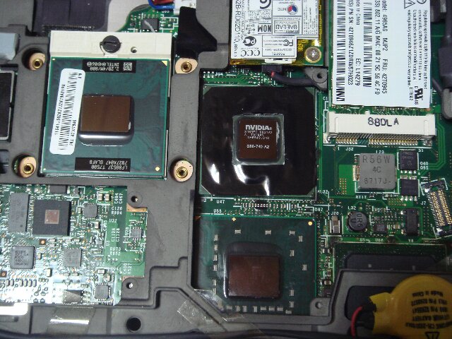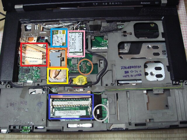 赤:CPU 橙:GPU 黄:チップセット 水色:モデムカード 桃色:無線LANカード 青:メモリスロット(2スロット)