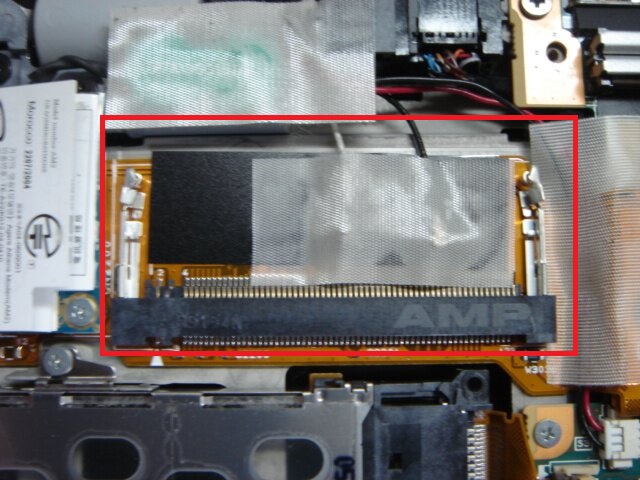 これでヒンジはしっかり立つようになりましたが、PCカードスロットを直さないといけませんね。このあたりです。