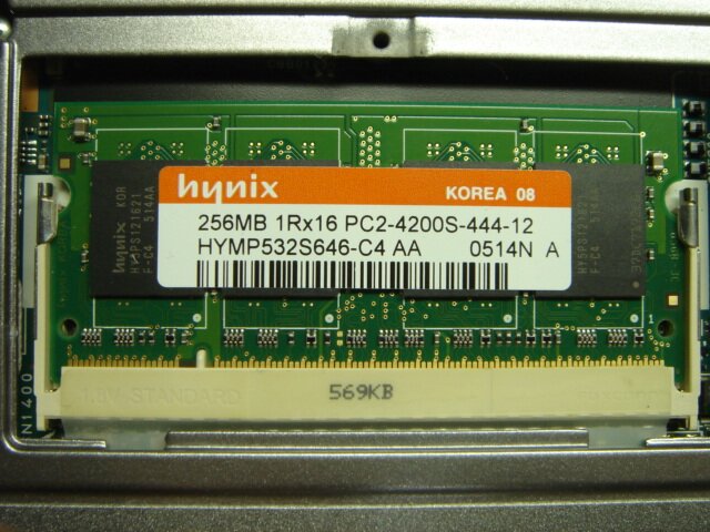もともと付いていたものがこちら。ちょっと珍しい、DDR2の256MBですね。(Hynix DDR2-SODIMM PC2-4200S 256MB)